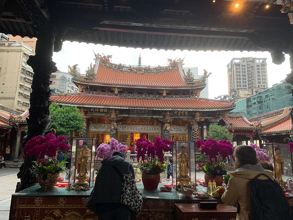 Middagsmessen var i gang, og lyden af trommen og fremsigelser af de buddhistiske suttraer kunne høres ud på gaden, hvor tiggere og et par munke sad ved indgangen til tempelkomplekset. Templet blev bygget under Qing-dynastiet i 1738 til ære for den buddhistiske Bodhisattva, Guanyin 觀音菩薩, og fungerer i dag som en af de største buddhistiske helligdomme i Taipei. Ved indgangen attesterede templets helligdom, der har overlevet naturkatastrofer og bombardementer:
