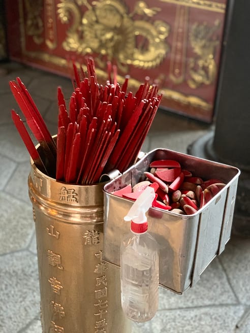 Jiaobei 筊杯,også kaldet måneblokke, udskåret i træ, klikkede mod stengulvet i forenden af templet, hvor tilbedere spurgte guderne til råds. En taiwansk bekendt, der arbejder i et stort europæisk firma, forklarede mig, hvordan han bruger måneblokkene: